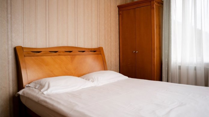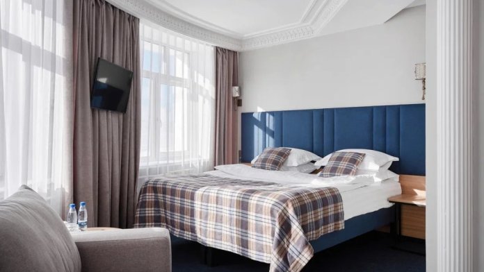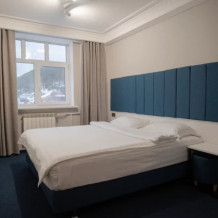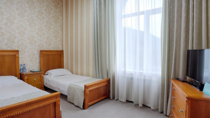 В номере: одна двуспальная кровать или две односпальные, прикроватные тумбочки, комод, шкаф, телевизор, телефон.