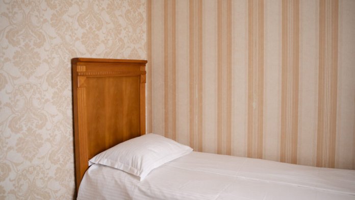 В номере: одна кровать, прикроватная тумбочка, комод, трюмо с зеркалом, плательный шкаф, телевизор, телефон, уютная ванная комната.