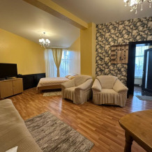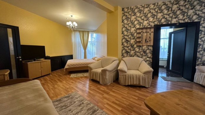Трехместный улучшенный номер на первом этаже. В номере двуспальная кровать и односпальная кровать, диван, кресла, телевизор, холодильник, чайник, чайные пары, душ, туалет, туалетные принадлежности.