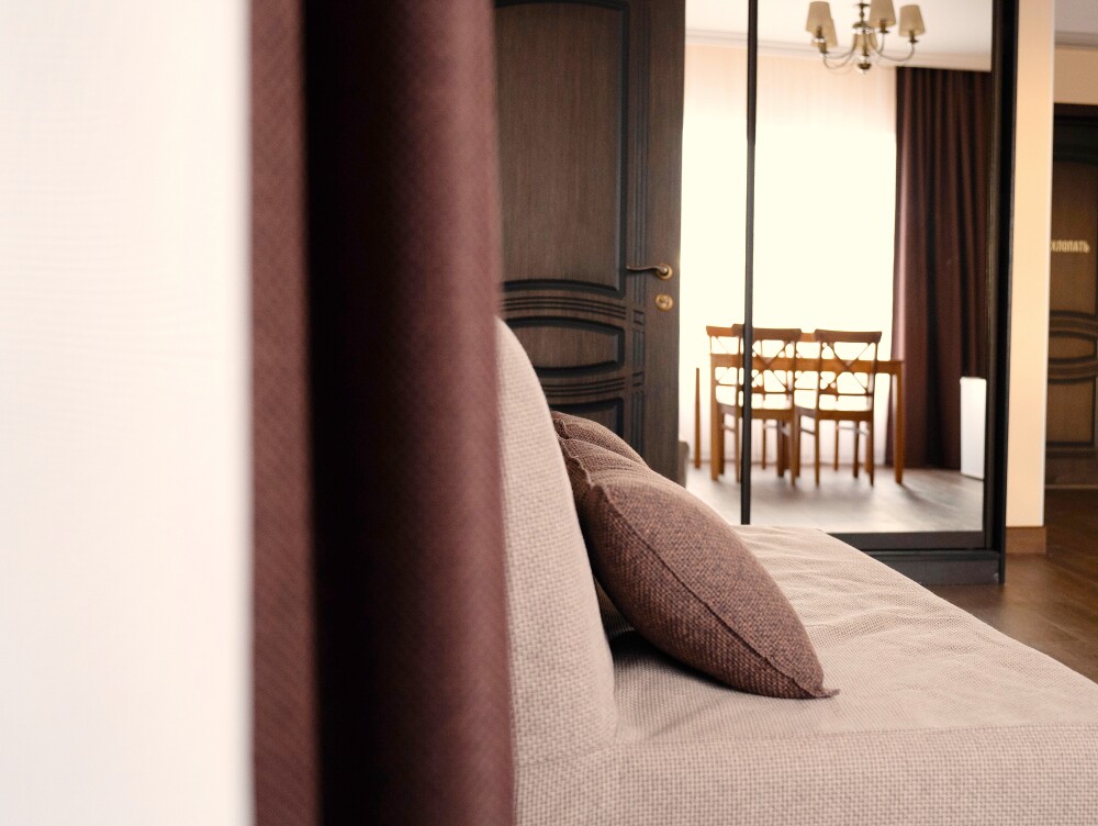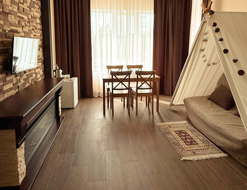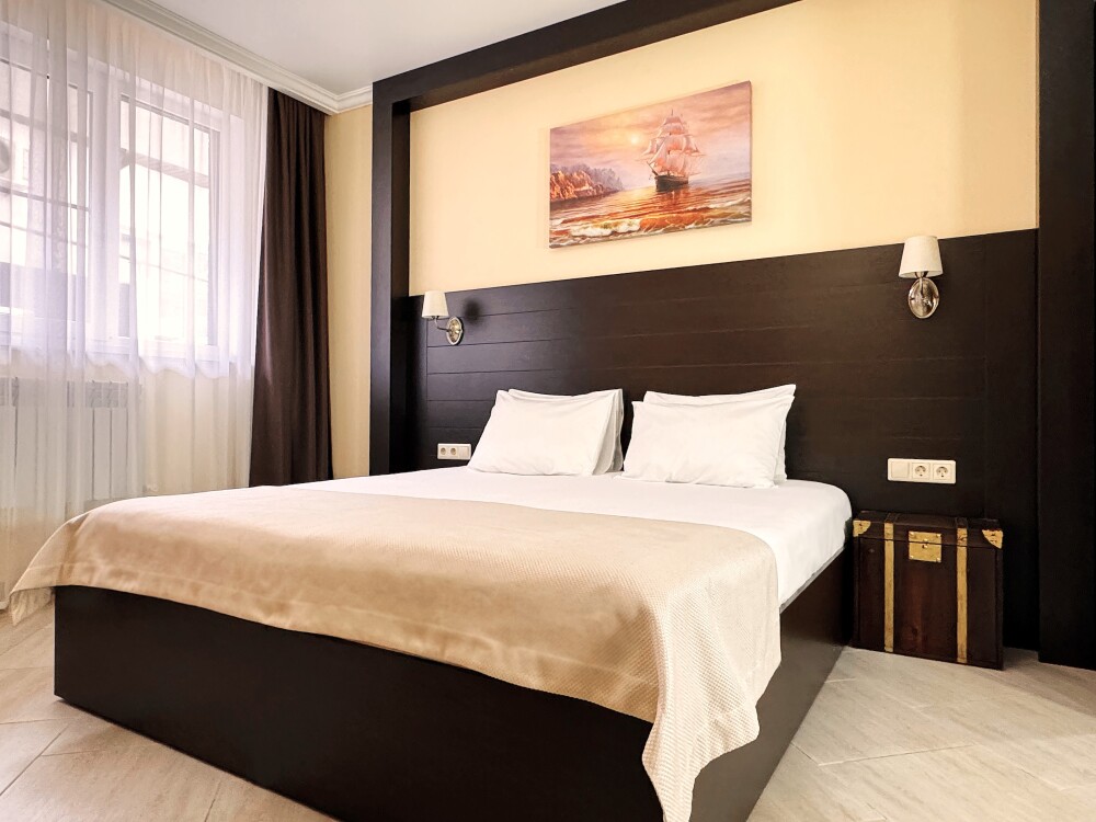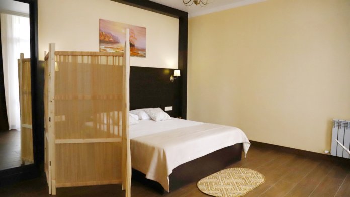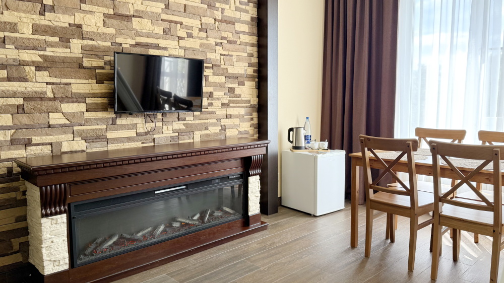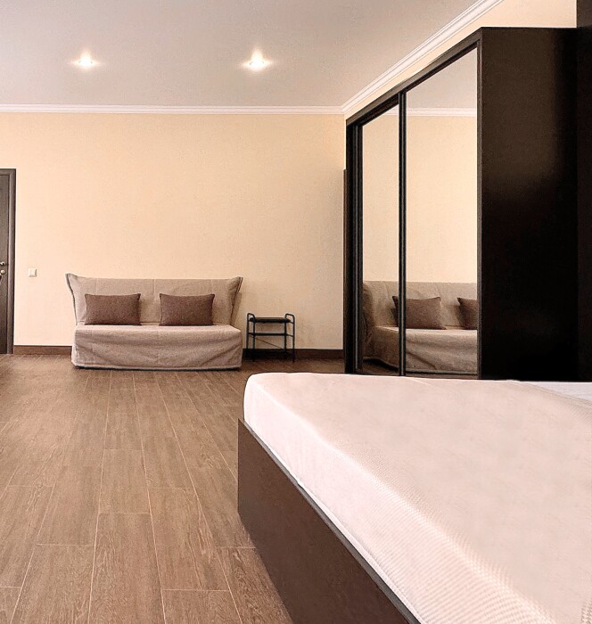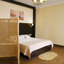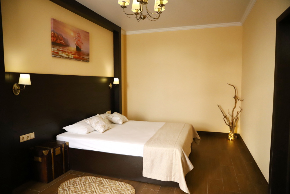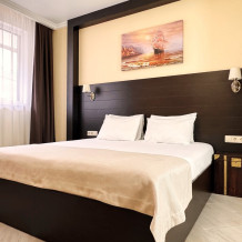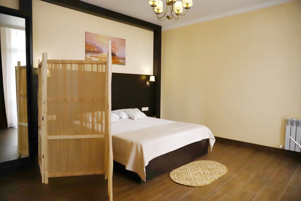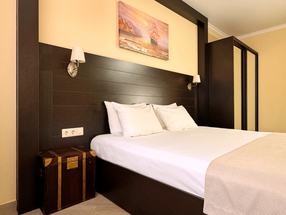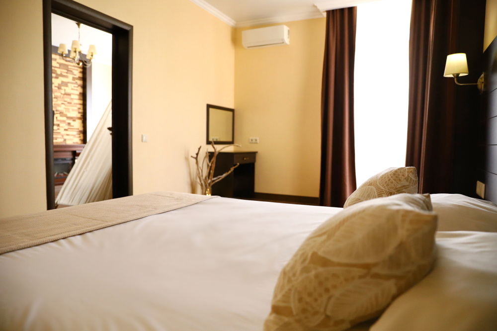 Однокомнатный номер с отельным входом. Номер оснащен: двуспальная кровать, диван-кровать (140*190), прикроватные тумбочки, шкаф-купе, обеденная группа, ТВ, кондиционер, сейф, мини-холодильник, бутилированная вода, чайная станция. Ванная комната: душ, раковина, туалет, фен, полотенца, гигиенические средства, халат, тапочки. Дети до 5 лет проживают без предоставления места.