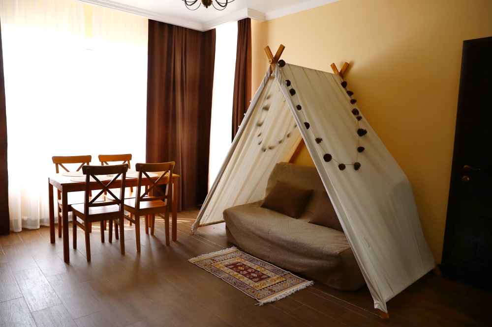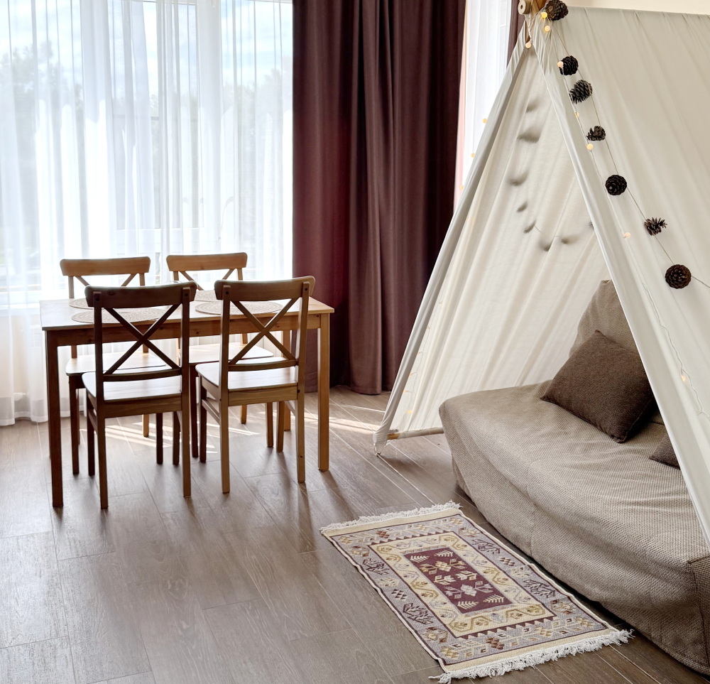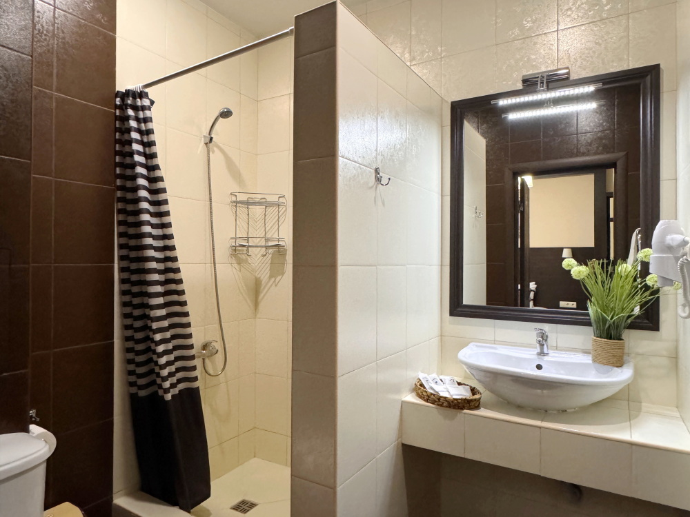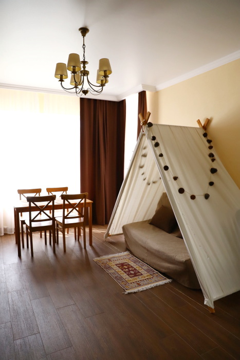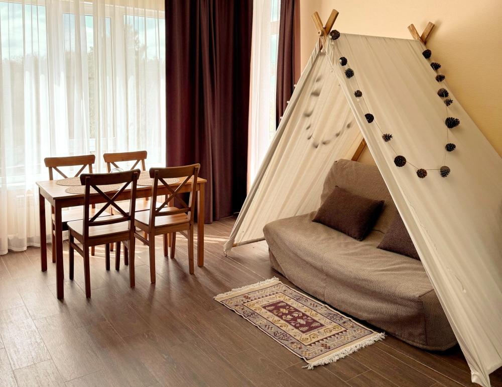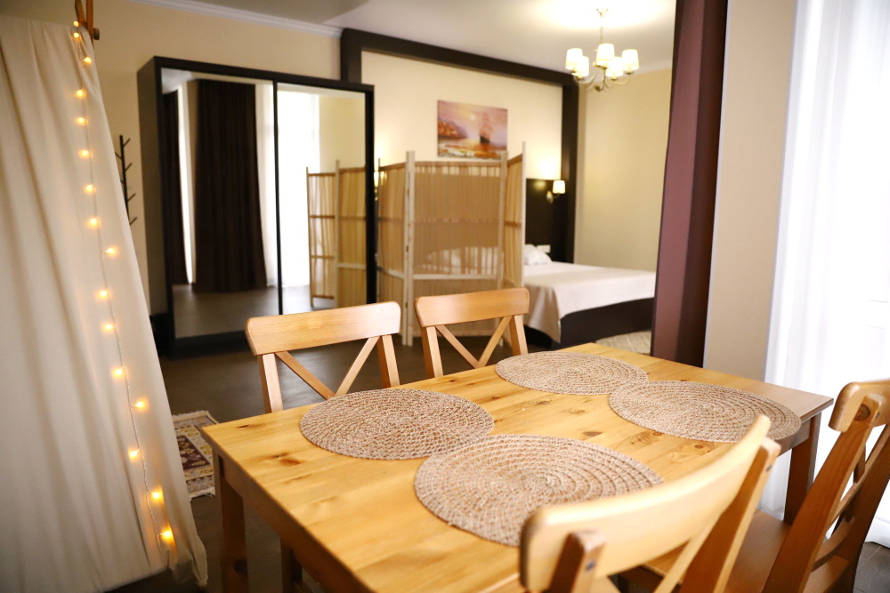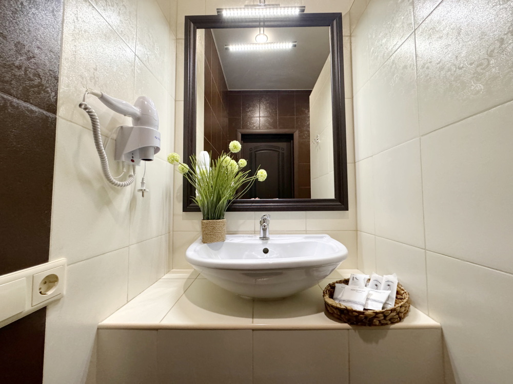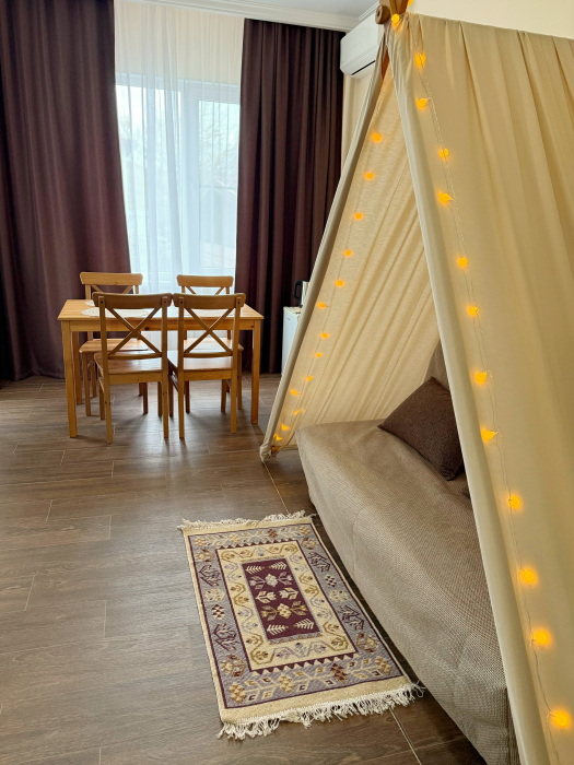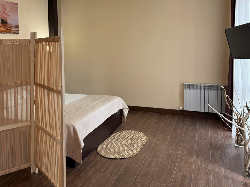 Однокомнатный номер с отельным входом. Номер оснащен: двуспальная кровать, диван-кровать (140*190), прикроватные тумбочки, шкаф-купе, обеденная группа, ТВ, кондиционер, сейф, мини-холодильник, бутилированная вода, чайная станция. Ванная комната: душ, раковина, туалет, фен, полотенца, гигиенические средства, халат, тапочки. Дети до 5 лет проживают без предоставления места.