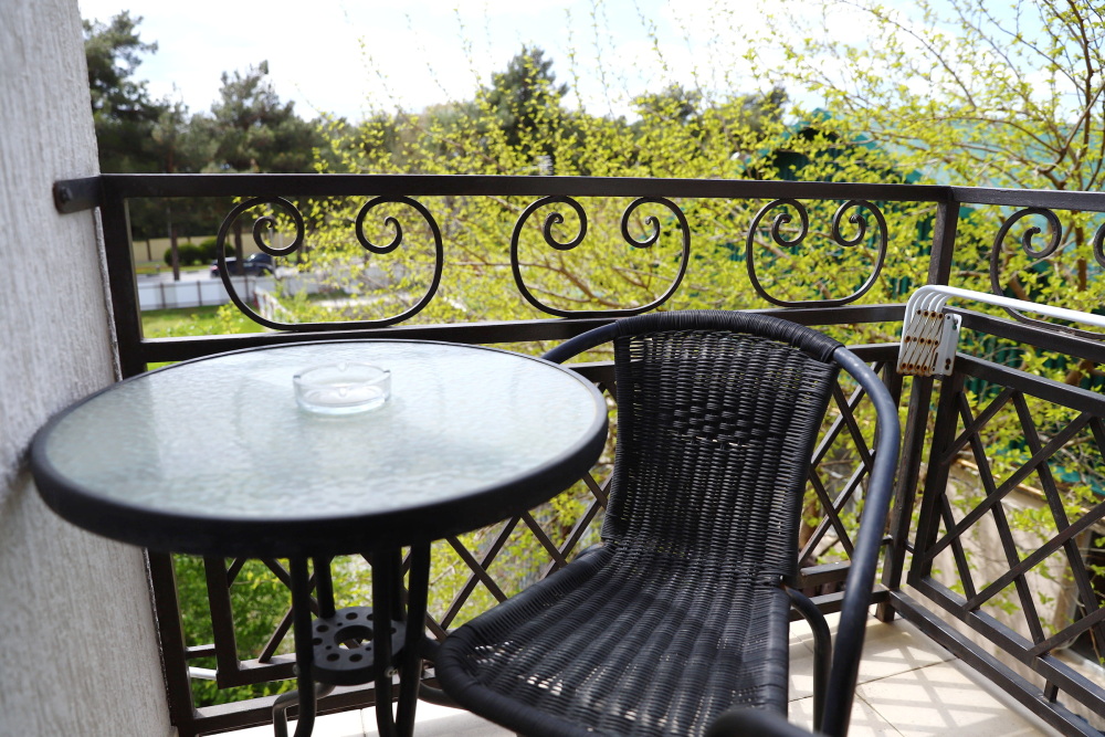 Двухкомнатный номер с балконом и видом на море. Гостиная: диван-кровать (140*190), шкаф-купе, обеденная группа, вешалка, ТВ, кондиционер, сейф, мини-холодильник, бутилированная вода, чайная станция. Спальня: двуспальная кровать, прикроватные тумбочки, туалетный столик, балкон со столом и стульями. Ванная комната: душ, раковина, туалет, полотенцесушитель, фен, полотенца, гигиенические средства, халат, тапочки. Балкон с видом на море. Дети до 5 лет проживают без предоставления места.