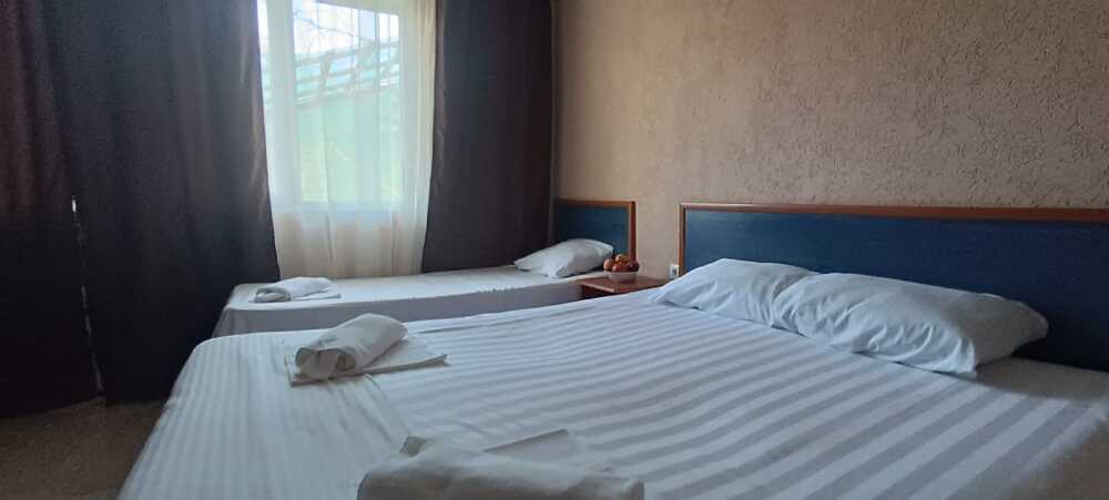 3-местный номер. Состоит из: 1 двуспальная кровать, 1 односпальная кровать, туалет, душ, кондиционер, холодильник (не во всех номерах), телевизор, Wi-Fi.