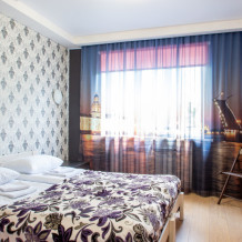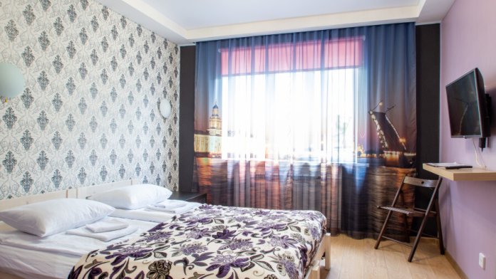 Номер с окном включает в себя: телевизор, гардеробную систему, WI-FI и двуспальную кровать, которая трансформируется в две односпальные.