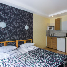 Номер с окнами, состоящий из двух смежных комнат. В номере: телевизоры, одна большая гардеробная система, WI-FI и две двуспальные кровати, которые трансформируется в четыре односпальные.