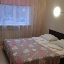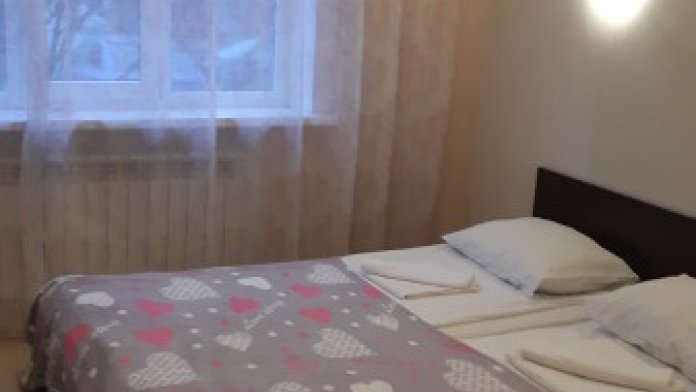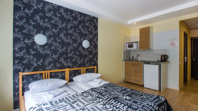 Номер с окном включает в себя: телевизор, гардеробную систему, WI-FI и двуспальную кровать, кухонный уголок (холодильник, чайник, раковина, микроволновая печь, посуда, приборы), столик.