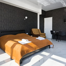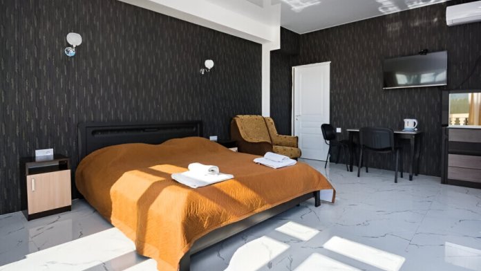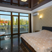 В номере: телевизор с плоским экраном, шкаф, холодильник, удобная двуспальная кровать, кондиционер, Wi-Fi, полотенца, тапочки.