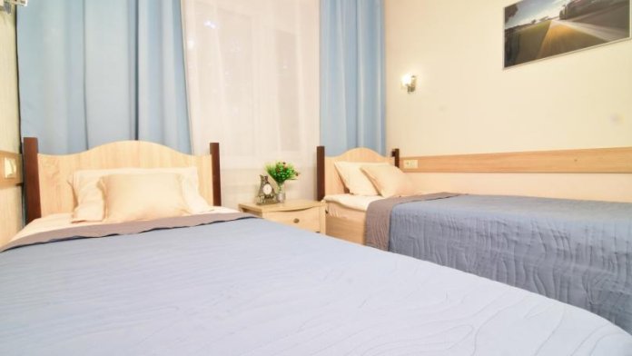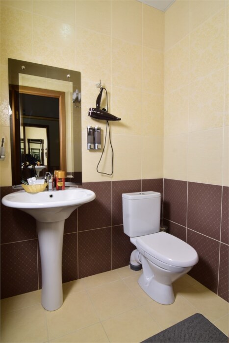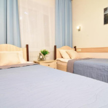 В номере: две односпальные кровати, 2 прикроватные тумбочки, письменный стол, стул, телефон, холодильник вместительный шкаф для одежды, тапочки, телевизор, кабельное ТВ, интернет бесплатный WI-FI, ванная комната со всеми удобствами: санузел, душевая кабина, раковина, фен, халат, набор полотенец, средства личной гигиены.