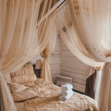 Уникальный номер для пар и молодожёнов, имеющий большую двуспальную кровать с балдахином нежных пастельных цветов, широкую ванну и всё необходимое для комфортного проживания, включая махровые халаты.