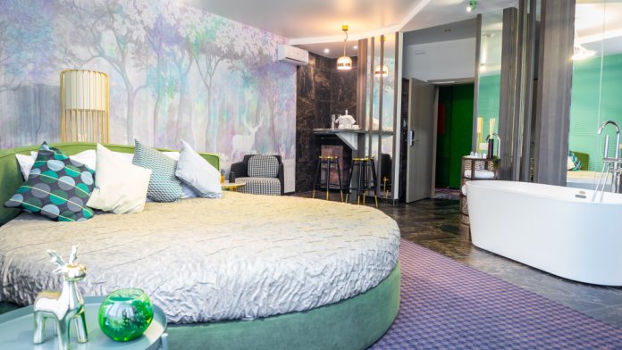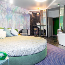 Двухместный номер с круглой кроватью диаметром 2 метра с ванной в комнате и отдельным санузлом с душевой кабиной.