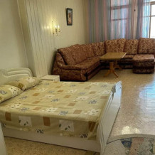 Двухкомнатный двухместный номер, площадью 33 кв.м. Номер находится на 2-м этаже. В номере есть: кондиционер, холодильник, телевизор. На балконе расположена кухня, с необходимой посудой для приёма и приготовления пищи. Также в номере есть с/у (душ, туалет), горячая и холодная воды круглосуточно. Кровать (спальное место 160 см), раскладной диван. С балкона номера открывается вид на город. Номер предназначен для 2 человек, с возможностью размещения 1 человека на доп. месте