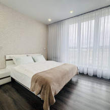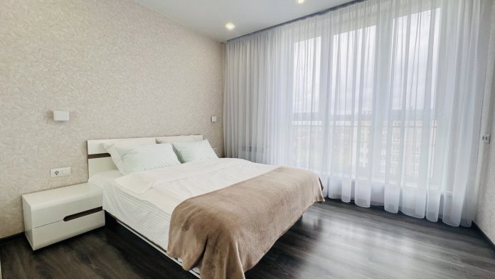 Просторная гостиная с большим телевизором и бесплатным вай-фаем, где Вы можете отдохнуть после насыщенного дня. В квартире есть комфортный двухспальный раскладной диван и светлая комната с панорамными окнами и двухспальной кроватью для приятного отдыха. Ванная комната оснащена белыми свежими полотенцами и феном для красоты волос. Также в Вашем распоряжении стиральная машина, утюг и гладильная доска, чтобы Вы всегда выглядели на высоте. На балконе Вы можете насладиться чашечкой кофе и наслаждаться видом на город.