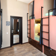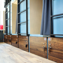 Оснащение капсулы: локер, полочка для вещей, светильник, двойная розетка, вешалка для одежды, шторка. Номер оснащен кондиционером. Душ и туалет на этаже.