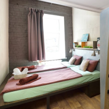 Номер оснащен полочками для гаджетов, индивидуальными светильниками и розетками. Также в номере столик для работы, вешалка для вещей, кондиционер. По запросу номер может быть укомплектован как три одноместных кровати или одна большая и одна одноместная. Душ и туалет на этаже.