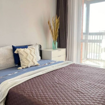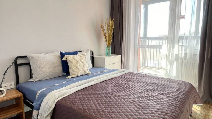 Комната: двуспальная кровать 160х200, постельное белье, подушки, одеяло, комод, рабочий стол, настольные лампы, дверь и выход на просторный балкон.