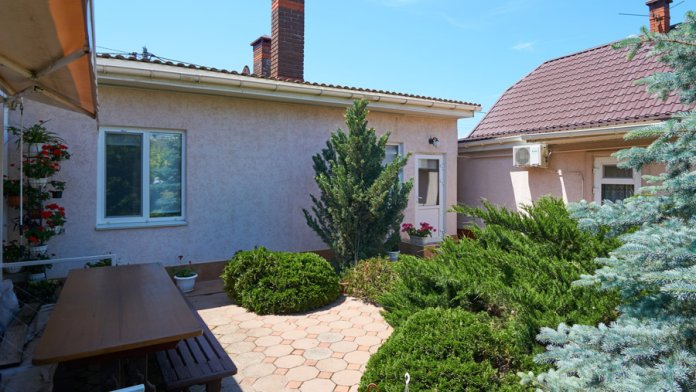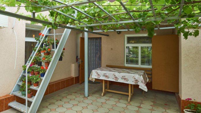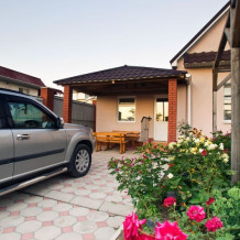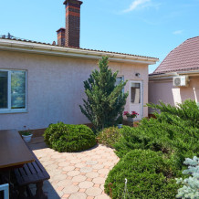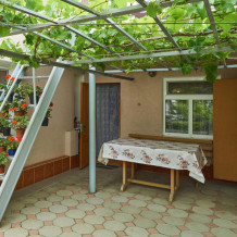 Виноградная беседка защищает от солнца, а осенью гости угощаются сладким, чёрным виноградом. На территории находятся 2 отдельно стоящих друг от друга дома. Для самых взыскательных предлагается 2-х комнатный коттедж-LUX, в котором с комфортом могут отдохнуть 5 человек. Второй дом разделён на 2 больших номера, каждый из которых имеет отдельный вход и свой уютный дворик. Номера рассчитаны на 4 и 5 человек. В каждых апартаментах есть всё для комфортного отдыха.