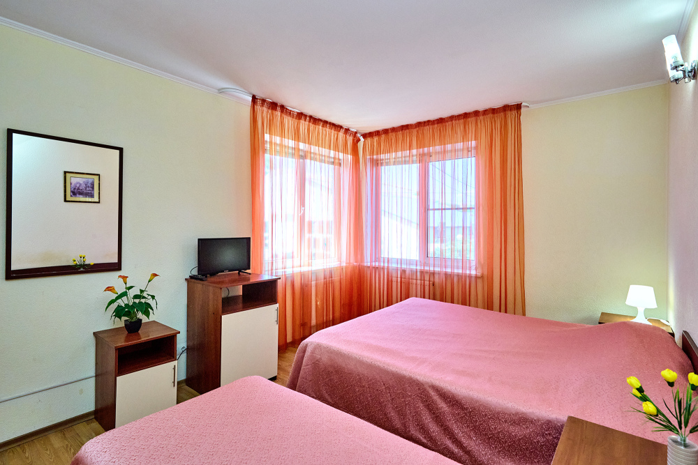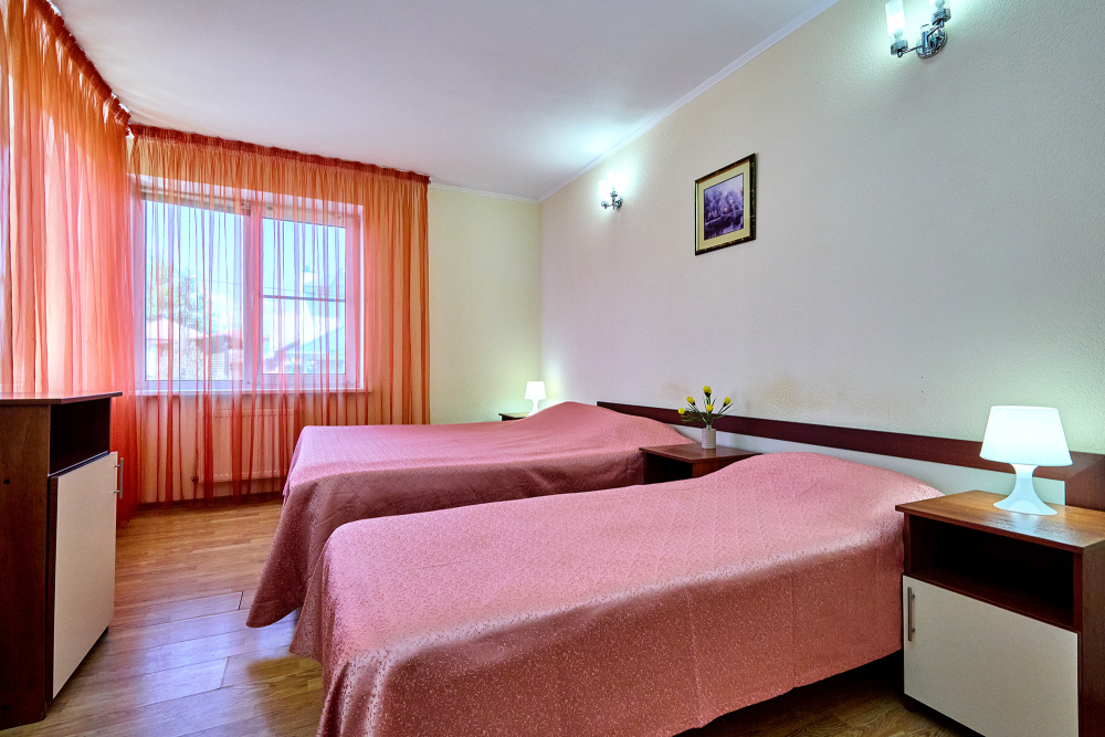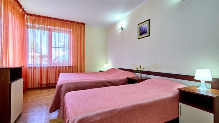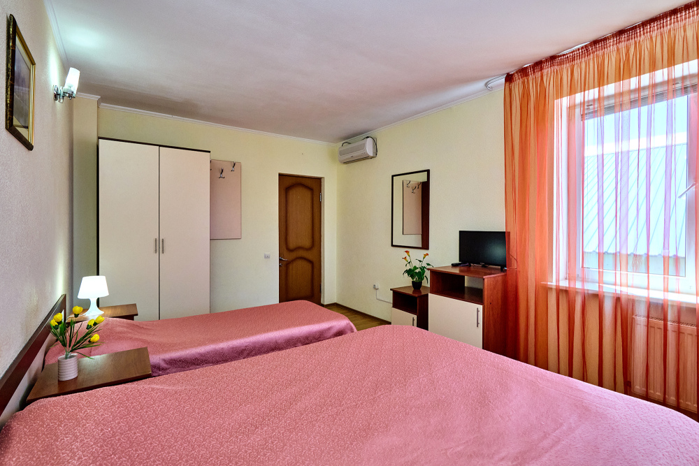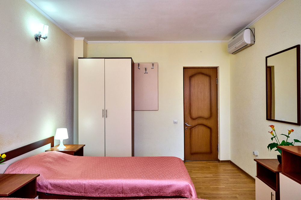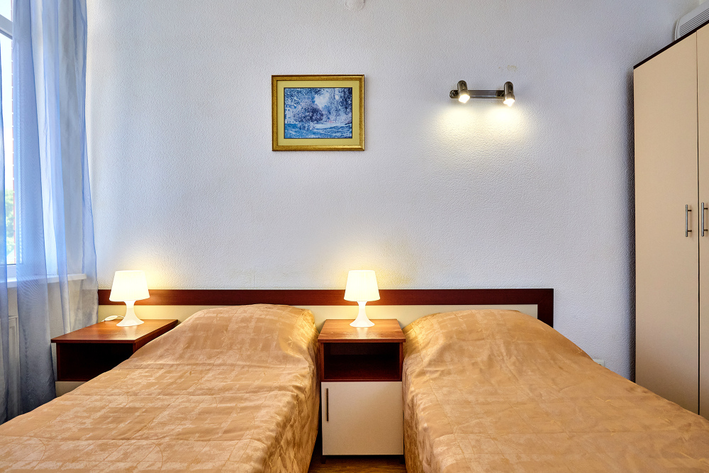 2-местный номер Эконом-класса без балкона с 1 двуспальной кроватью или 2 отдельными кроватями. В номере: сплит-система, холодильник, ТВ на 20 каналов, прикроватные тумбы и светильники, шкаф для одежды, полотенца, туалетные принадлежности, фен, электрочайник, набор посуды. Санузел и душевая кабина на этаже.