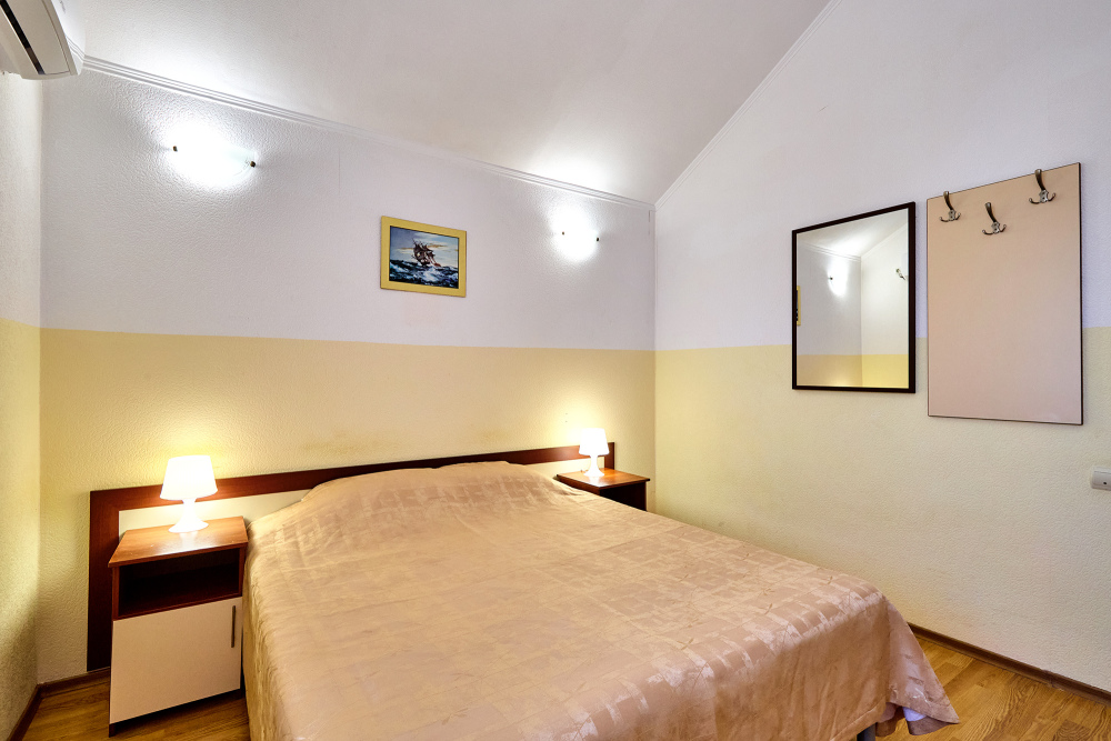 Стандартный 7-местный номер без балкона с 1 двуспальной кроватью, двуспальным раскладным диван-кроватью и 4 односпальные кровати. В номере: сплит-система, холодильник, ТВ на 20 каналов, прикроватные тумбы и светильники, шкаф для одежды, полотенца, туалетные принадлежности, фен, электрочайник, набор посуды, санузел и душ в номере.