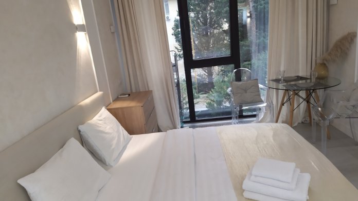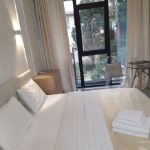 Уютная студия в ЖК «Метрополь», это единственный в Сочи объект, с эксплуатируемой крышей, на ней находятся мини-бассейны с лежаками, теннисный корт, тренажеры, на улице детская площадка, фонтан.