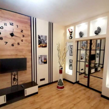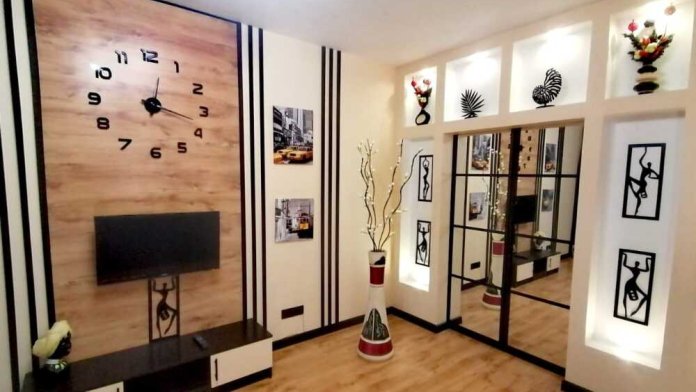 - В комнате: двуспальная кровать, диван раскладной, телевизор смарт, гардероб, в котором утюг, сушилка, гладильная доска, пылесос, кондиционер (сплит-система).