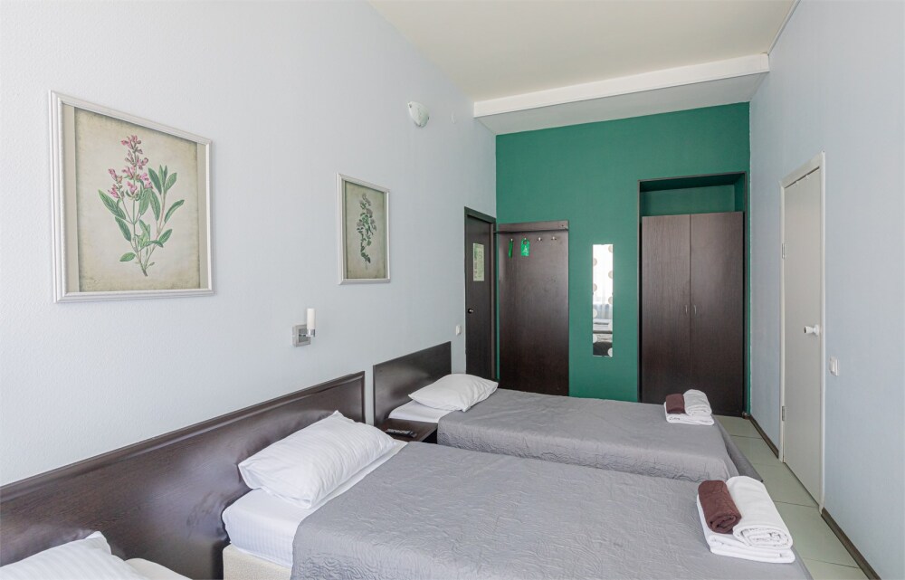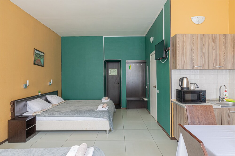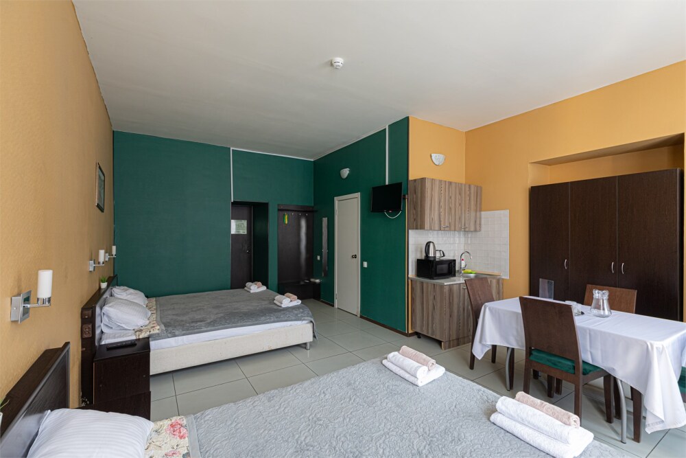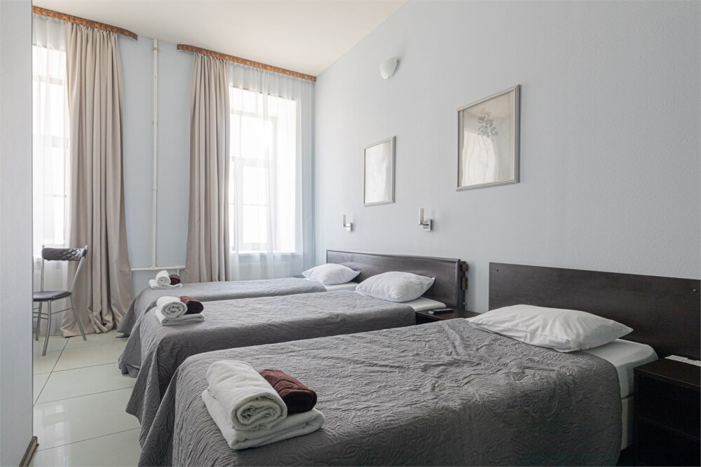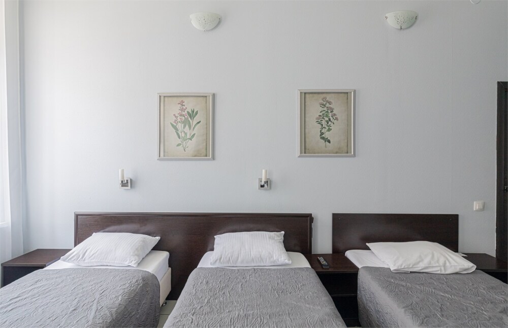 Большой уютный номер с одной двуспальной кроватью и двумя односпальными кроватями.