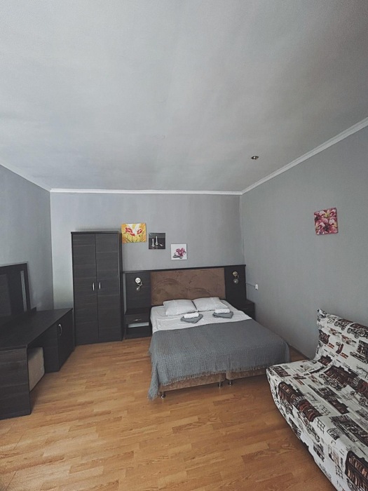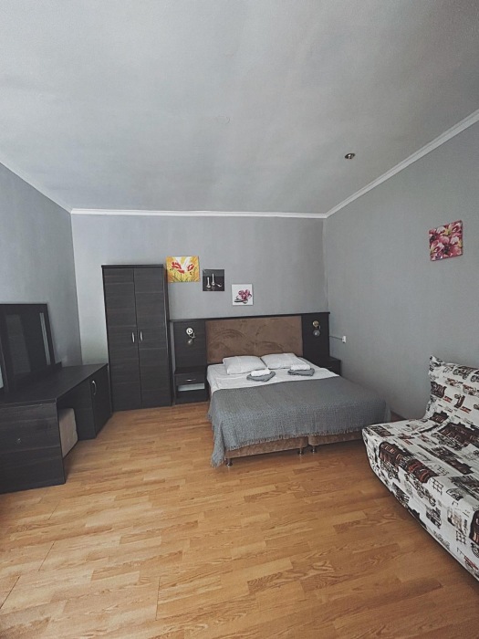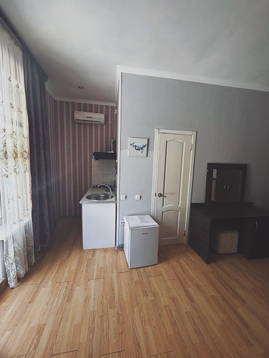 Номер-студия — это однокомнатный номер с кухней,что идеально подходит для длительного проживания. Кухонная зона (мини-кухня): Наличие электрической плиты, холодильника, раковины и набора посуды. Меблировка: Двуспальная кровать,диван-кровать, обеденный стол, стулья, шкаф, рабочее место. Оснащение: Кондиционер, телевизор, Wi-Fi. Ванная комната: Полноценный санузел (душ ), зеркало, набор полотенец, фен, косметические средства. Номер студия отлично подходит для тех, кто предпочитает готовить самостоятельно или путешествует с семьей.