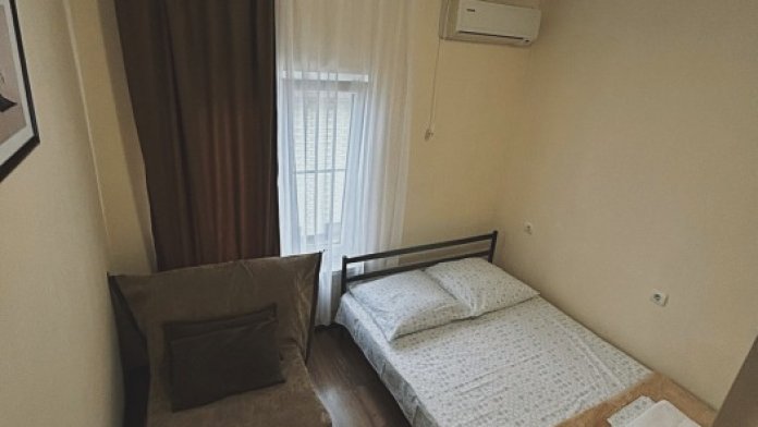 Балкон общий. В номере есть телевизор, стол, пуфик и прикроватные тумбочки. Ванная комната с раковиной, душ, также имеются индивидуальные наборы косметических средств для гостей. Комфортную температуру обеспечивает сплит система кондиционирования.