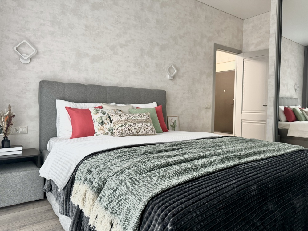 - Просторная кровать шириной 160 см с ортопедическим матрасом, удобный и современный диван. Для каждого гостя предусмотрено качественное постельное белье (хлопок, страйп-сатин), подушка и отдельное одеяло, комплект полотенец и средства гигиены;