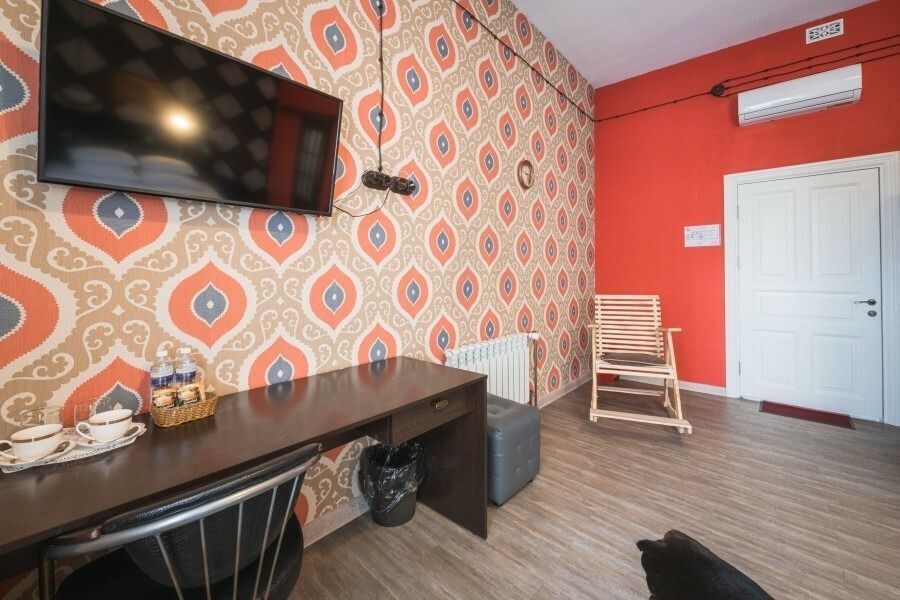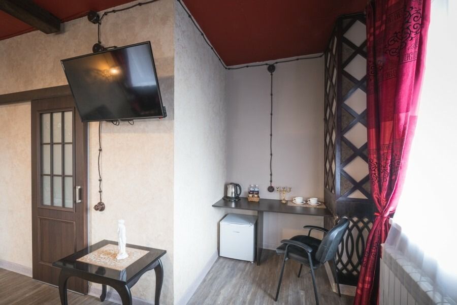 В номере есть все необходимое для комфортного проживания: кровать с матрасом повышенной комфортности, обеденная зона, рабочее пространство, телевизор, чайник, холодильник, отдельная ванная комната с феном и принадлежностями.