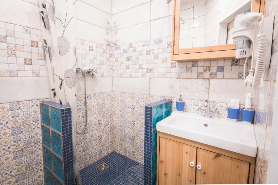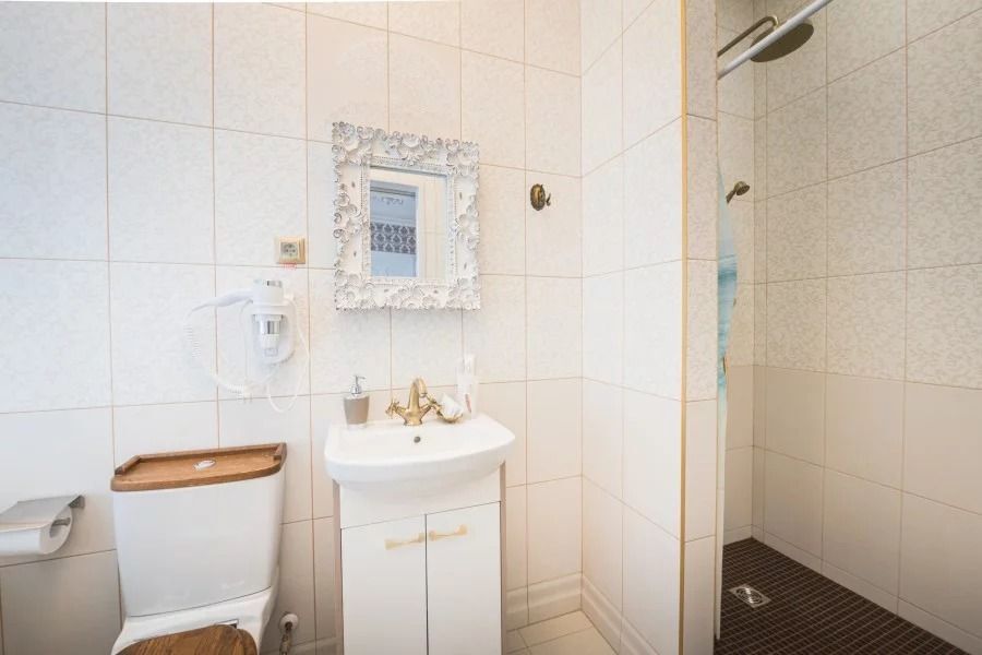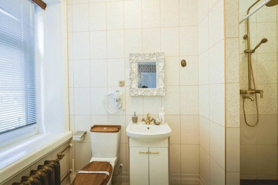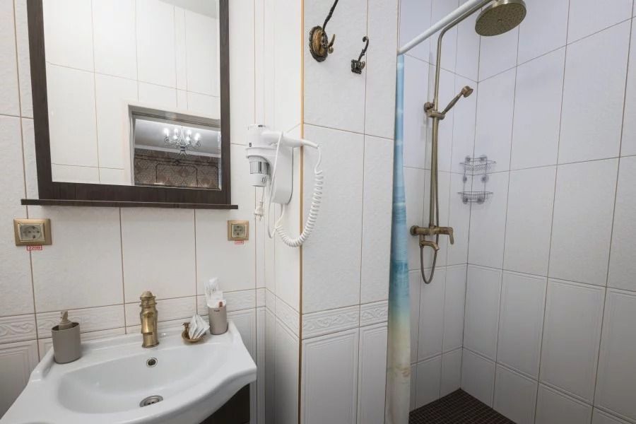 В номере: широкая кровать с матрасом повышенной комфортности, 4 подушки, большой и удобный шкаф, кресло, телевизор, обеденная зона, столик, чайник, холодильник, просторная ванная комната с феном и принадлежностями.