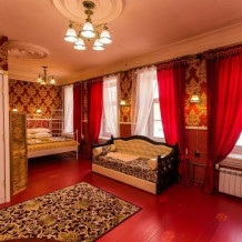 Каждый номер оформлен в историческом стиле по индивидуальному дизайну. В отеле есть номера «Купеческий», «Царские палаты», «Русская печка», а также комната, напоминающая монгольскую юрту, комната в стиле Прованс и другие. В каждом номере гости отеля могут перенестись в прошлое и почувствовать себя представителями разных сословий. При этом в номерах есть все современные удобства для проживания. Гостевой дом подходит для тех, кто предпочитает эксклюзивное размещение, а также ценит комфорт и уединение!