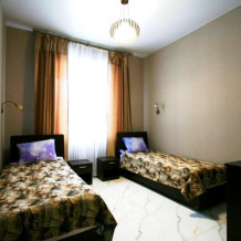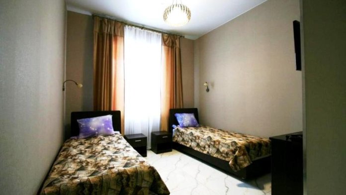 Комплектация номера: две односпальные кровати, платяной шкаф, тумбочки, туалетный столик, ЖК телевизор, кабельное ТВ, высокоскоростной Wi-Fi, чайник, фен, гигиенические принадлежности.