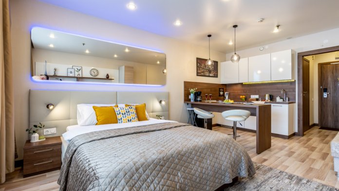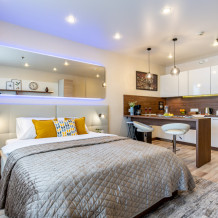 - В комнате 1 двуспальная кровать, и односпальный диван-тахта, в кухонной зоне барная стойка с барными стульями и кухонным гарнитуром. Есть гладильная доска и сушилка для белья, утюг. Стиральная машина в зоне кухни.