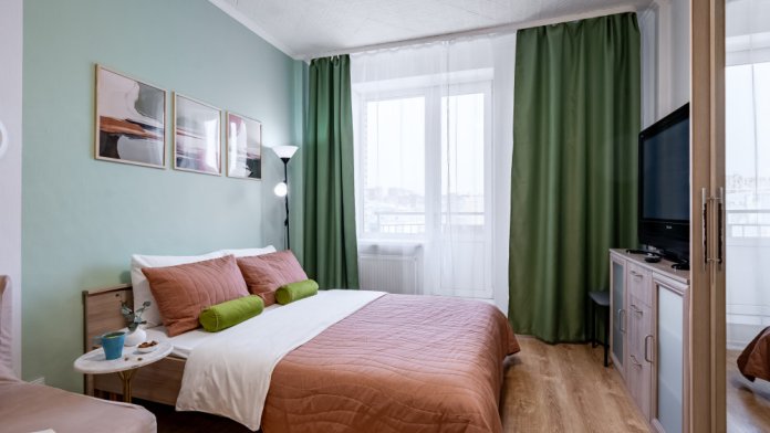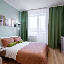 - В комнате 1 двуспальная кровать, и односпальный диван (диван не раскладывается), обеденная группа, и кухонная зона с кухонным гарнитуром. Есть гладильная доска и сушилка для белья, утюг.