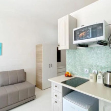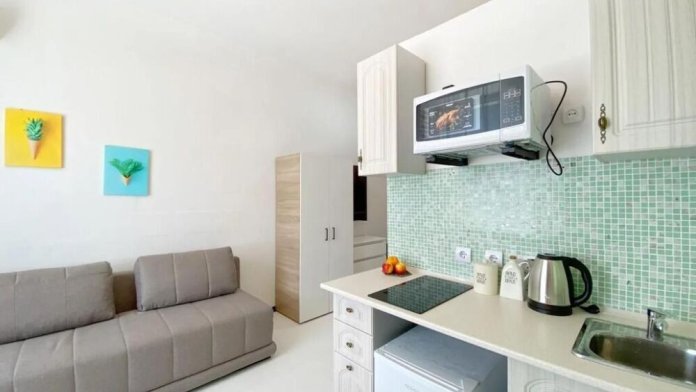 В квартире есть все необходимое: удобный двуспальный диван, кухонный гарнитур, плита, микроволновка, чайник, стиральная машина, фен, телевизор, шкаф, обеденная зона, гладильные принадлежности, Wi-Fi.