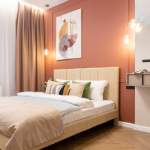 - Удобную двуспальную кровать с ортопедическим матрасом и раскладной диван для двух дополнительных мест.