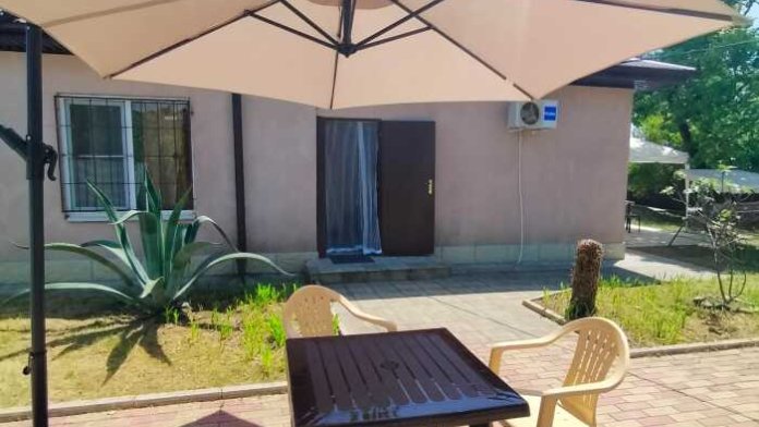 Во дворе выложена плитка, есть пластиковые столы и стулья, зонты от солнца, беседка. Имеется мангальная зона с мангалом. Есть отдельное строение с душем и туалетом, внутри установлен бойлер.