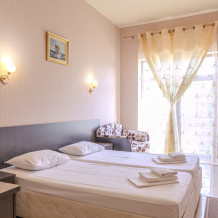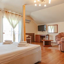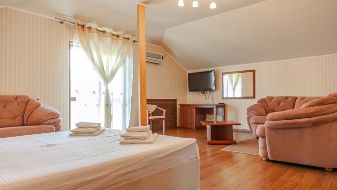 Дизайн интерьера оформлен в едином классическом стиле, выполнен современный ремонт, приятная цветовая гамма радует глаза. В номерах созданы все условия для полноценного размещения и проживания: кровать, шкаф для одежды, кондиционер, телевизор с плоским экраном, собственная ванная комната, сейф.