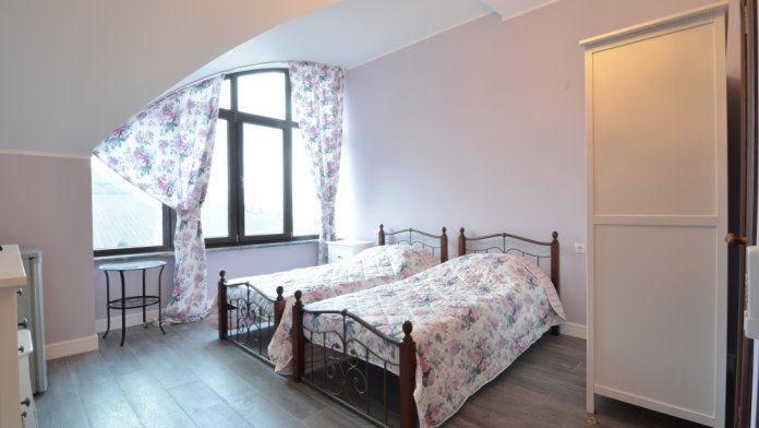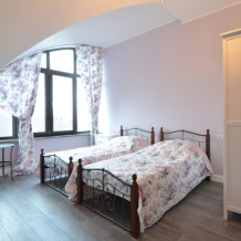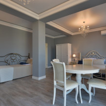 Это трёхместный однокомнатный номер на мансарде светлый и просторный, с панорамным окном, откуда открывается великолепный вид на виноградники, море и горы.
