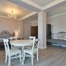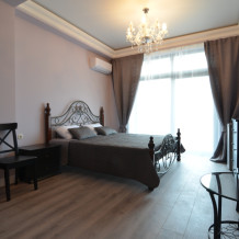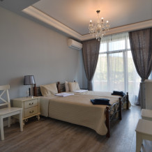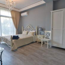 Это трёхместный однокомнатный номер светлый и просторный, с большим панорамным окном, откуда открывается великолепный вид на виноградники, море и горы.