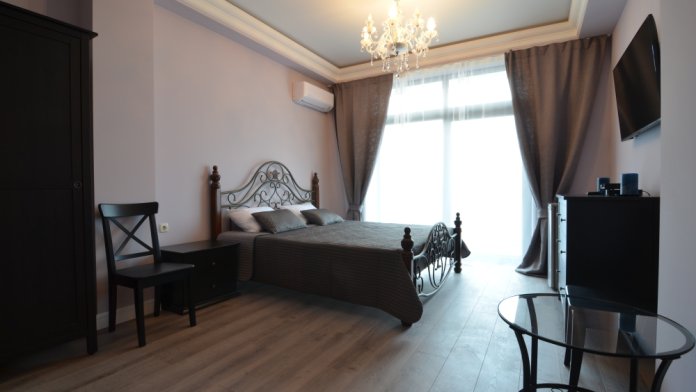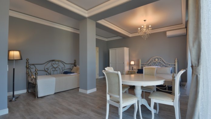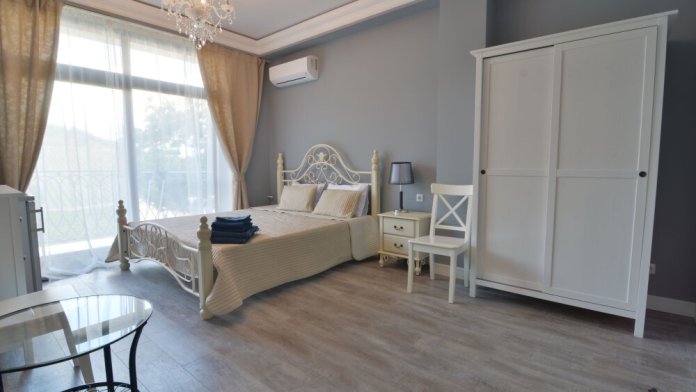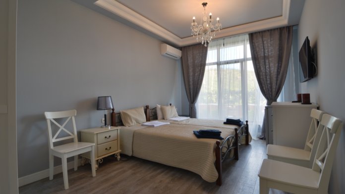 Это двухместный однокомнатный номер светлый и просторный, с панорамным окном, откуда открывается великолепный вид на виноградники, море и горы.
