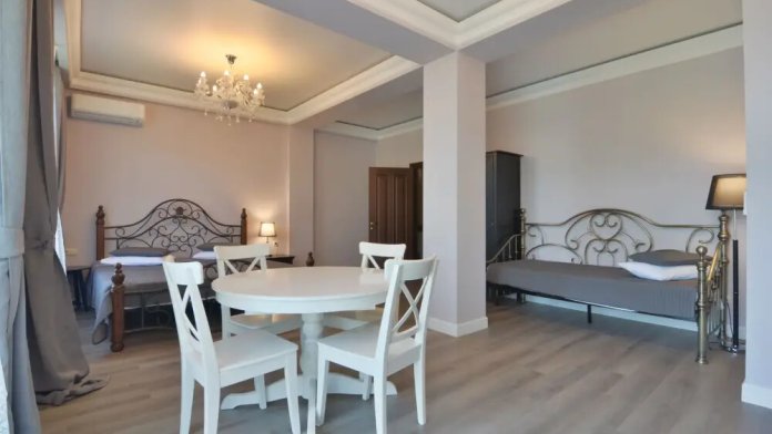 Трёхместный однокомнатный номер светлый и просторный, с большим панорамным окном, частично видно виноградники, море и горы.