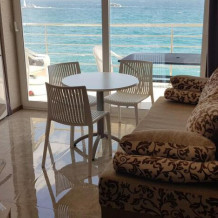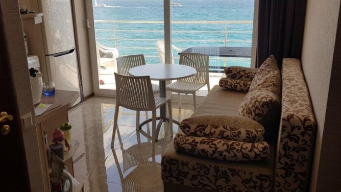 Апартаменты расположены на 3 этаже, рассчитаны на комфортный отдых 4 человек и укомплектованы всем необходимым. Представляют собой 4-местный номер в спа-отеле, а именно спальня (2 раскладных двуспальных дивана) совмещенная с кухней-гостиной с раскладным диваном. Полноценная кухня с посудой, холодильником и стиральной машиной. Санузел с душевой кабиной, панорамный балкон (со столом, стульями и лежаком) с видом на море, горы, Ялту.