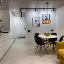 Кухня-гостиная: холодильник, плита, микроволновка, полный набор посуды и бокалов, чай, кофе, соль, сахар, стиральная машина, фен, утюг, тёплый пол.