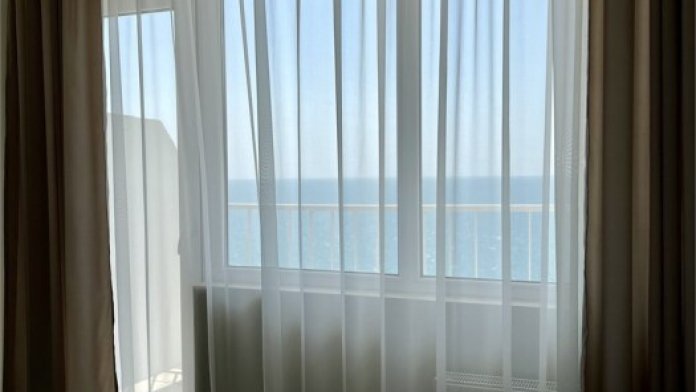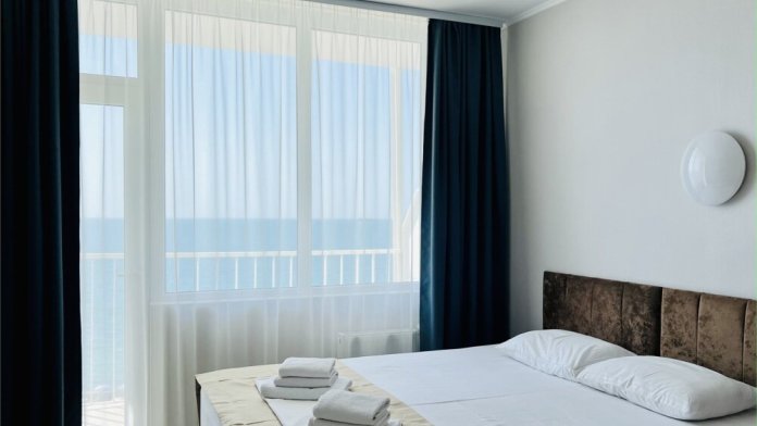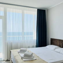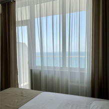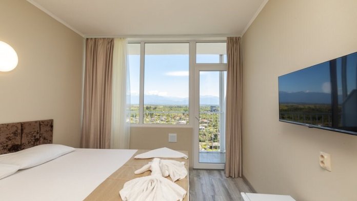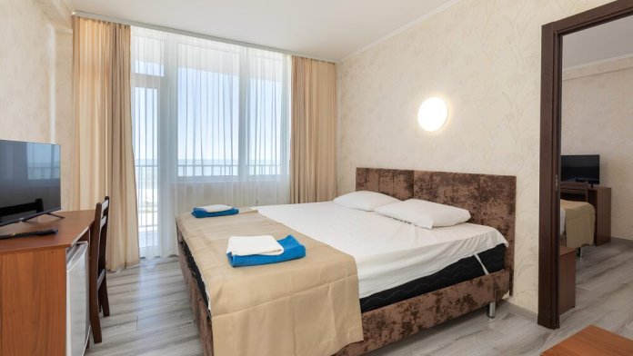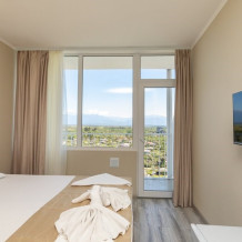Номер: оборудован двуспальной кроватью, прикроватными тумбочками, чемоданницей, столом, стулом, шкафом, телевизором, холодильником, санузлом с душем. Из номера открывается вид на горы и море благодаря панорамным окнам.