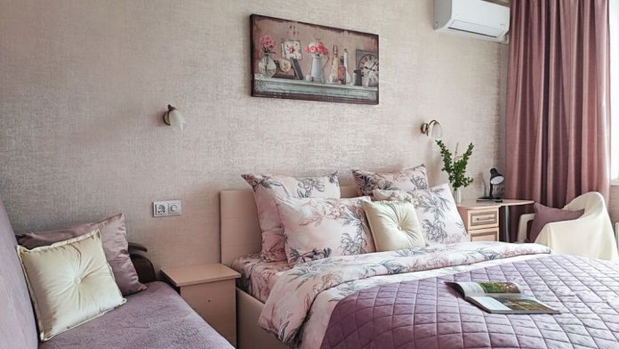 Новый дом, ремонт в светлых тонах, легкость, воздушность. В квартире есть всё для комфортного проживания гостей: кондиционер, ролл-жалюзи (блокируют солнце) на кухне и в комнате. Открытый балкон, много воздуха. В комнате кровать 1,6 на 2 м, диван (спальное место 0,9 на 2 м.). Диван в кухне (спальное место 1 м на 1,9) для комфорта предусмотрены матрасики. Постельное бельё, полотенца и посуда. Wi-Fi, кабельное телевидение, фен, утюг, гладильная доска, сушилка для белья, посуда все новое, чай, сахар. Душевая кабина, биде.