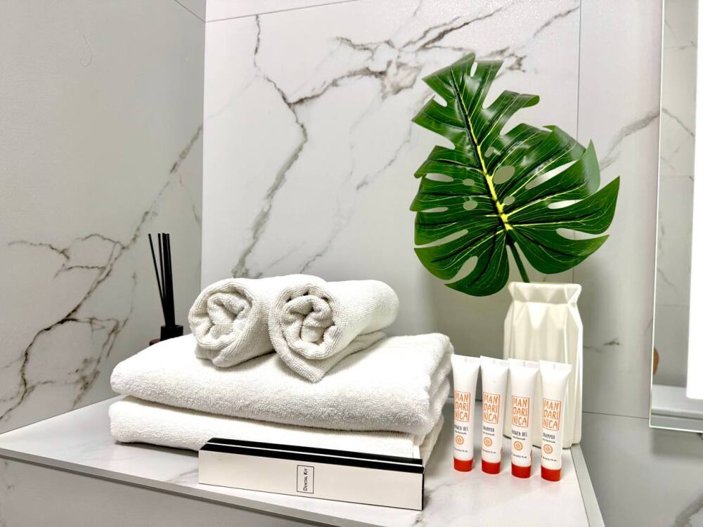 - Для каждого гостя подготовлено по 2 полотенца (для душа и рук) + 1 полотенце для ног.