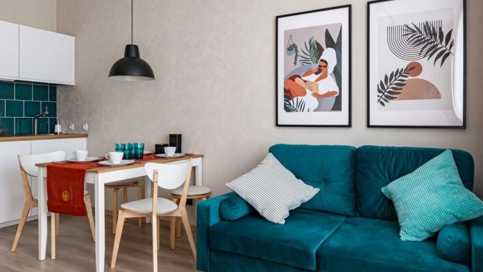 В квартире с комфортом могут разместиться 4 взрослых человека. Предусмотрено 2 спальных места: большая двухспальная кровать, а также диван, который раскладывается при необходимости. Для гостей предусмотрен комплект постельного белья (4 подушки, 2 одеяла), а также полотенца (большое и маленькое для каждого гостя). Кухня оборудована всем необходимым для постоянного проживания: есть кухонная утварь (столовые приборы, тарелки, чашки для чая, стаканы, бокалы для вина, ножи, кастрюли, сковорода, разделочные доски, терка, штопор, ножницы, половник, венчик, лопатка), всегда в распоряжении гостей чай, кофе, сахар, соль. На кухне есть микроволновая печь СВЧ (за кухонным фасадом), капсульная кофемашина, электрический чайник и электрическая плита, а также большой вместительный холодильник с морозильной камерой.