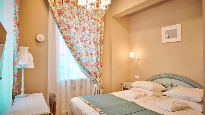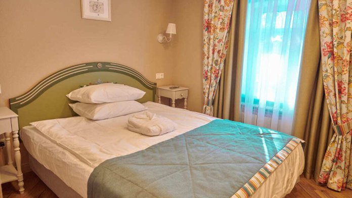Уютный номер для одного гостя, возможно размещение двоих. В номере: двуспальная кровать Queen size (160 см) с прикроватными тумбочками, рабочий стол, телевизор, кондиционер, телефон, мини-холодильник, сейф, электрический чайник и чайный набор. В душевой комнате с окном: мягкие полотенца, халаты, тапочки, фен и средства личной гигиены.