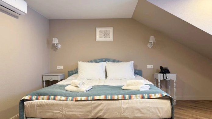 Расположен на 2 (мансардном) этаже. Номер двухместный, но возможно дополнительное спальное место для 3-го человека на уютном диване. В номере находятся: двуспальная кровать king size (180 см) или twin с прикроватными тумбочками, раскладной диван, телевизор, телефон, мини-бар, сейф, кондиционер, электрический чайник и чайный набор. Просторная душевая комната с белоснежными халатами, мягкими полотенцами, тапочками, феном, индивидуальными гигиеническими принадлежностями. Для более комфортного отдыха предлагаем бесплатный Wi-Fi.